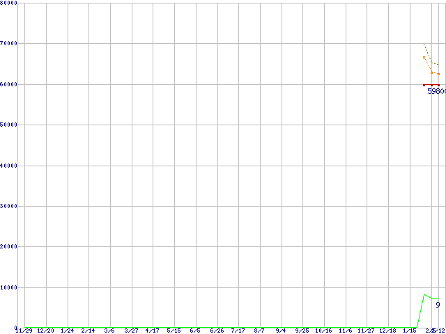 ※このグラフは過去のデータも税率5%相当に調整した税込み相当額のグラフです。 税率変更や、総額表示方式導入(2004年4月)の影響は除いています。 | | | ●凡例 | 最安値 (点線部は販売店未確認 または未調査) | 平均値 | 最高値 | ショップ数 |