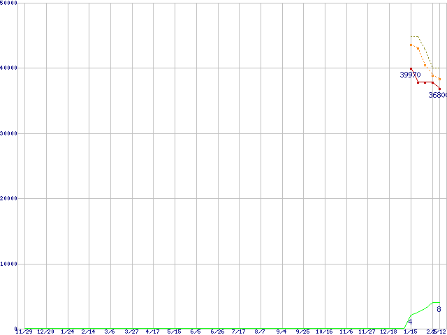 ※このグラフは過去のデータも税率5%相当に調整した税込み相当額のグラフです。 税率変更や、総額表示方式導入(2004年4月)の影響は除いています。 | | | ●凡例 | 最安値 (点線部は販売店未確認 または未調査) | 平均値 | 最高値 | ショップ数 |