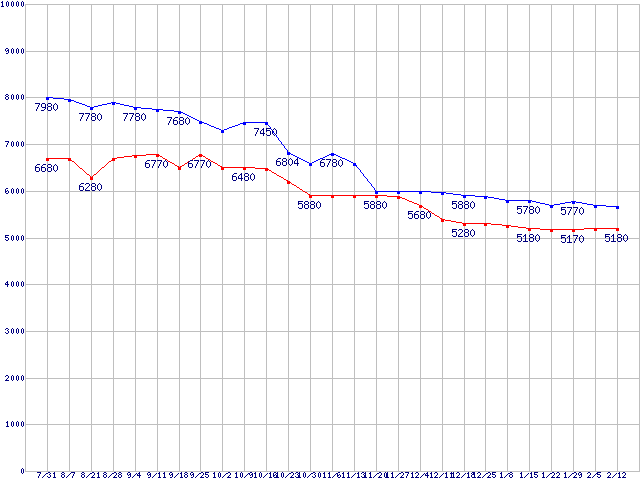 WD Caviar Blue (7200rpm,3Gb/s,16MB)の最安値推移