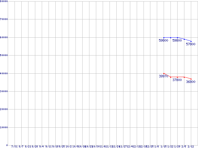| TITAN (SSD,3Gb/s,2.5インチ,リード200MB/s・ライト160MB/s)の最安値推移 | | | (2008年7月31日~2009年2月12日) |