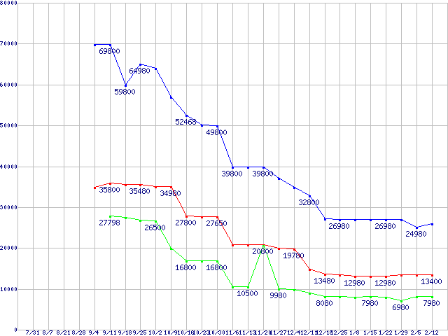 | OCZ Core Series V2 SATA II 2.5" SSD (SSD,3Gb/s,2.5インチ,リード170MB/s・ライト98MB/s)の最安値推移 | | | (2008年7月31日~2009年2月12日) |
