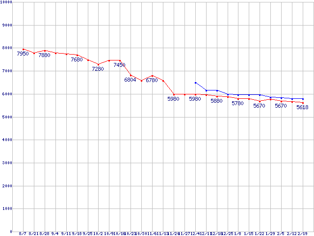 HDD 750GB~1TB未満の最安値推移