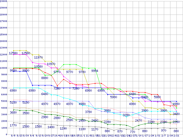 メモリ主要製品(最安値5千円~1万円未満)の最安値推移
