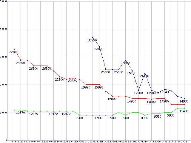 メモリ主要製品(最安値1万円以上)の最安値推移