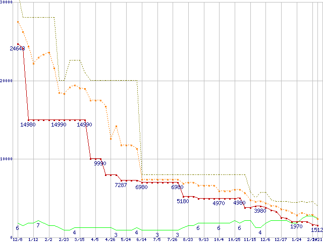 ※このグラフは過去のデータも税率5%相当に調整した税込み相当額のグラフです。 税率変更や、総額表示方式導入(2004年4月)の影響は除いています。 | | | ●凡例 | 最安値 (点線部は販売店未確認 または未調査) | 平均値 | 最高値 | ショップ数 |