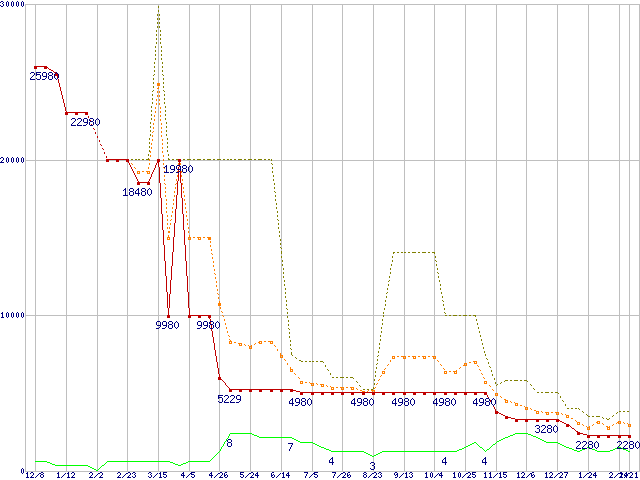 ※このグラフは過去のデータも税率5%相当に調整した税込み相当額のグラフです。 税率変更や、総額表示方式導入(2004年4月)の影響は除いています。 | | | ●凡例 | 最安値 (点線部は販売店未確認 または未調査) | 平均値 | 最高値 | ショップ数 |