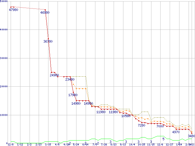 ※このグラフは過去のデータも税率5%相当に調整した税込み相当額のグラフです。 税率変更や、総額表示方式導入(2004年4月)の影響は除いています。 | | | ●凡例 | 最安値 (点線部は販売店未確認 または未調査) | 平均値 | 最高値 | ショップ数 |
