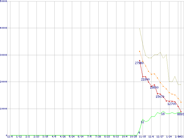 ※このグラフは過去のデータも税率5%相当に調整した税込み相当額のグラフです。 税率変更や、総額表示方式導入(2004年4月)の影響は除いています。 | | | ●凡例 | 最安値 (点線部は販売店未確認 または未調査) | 平均値 | 最高値 | ショップ数 |
