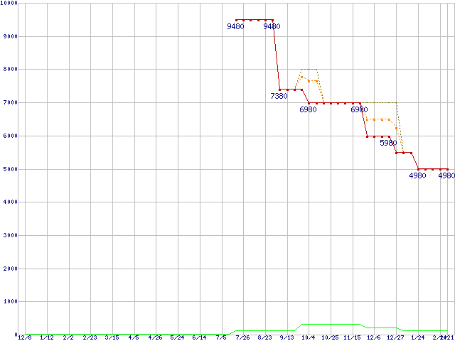 ※このグラフは過去のデータも税率5%相当に調整した税込み相当額のグラフです。 税率変更や、総額表示方式導入(2004年4月)の影響は除いています。 | | | ●凡例 | 最安値 (点線部は販売店未確認 または未調査) | 平均値 | 最高値 | ショップ数 |