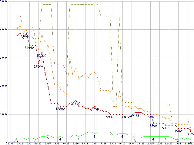 メモリ主要製品(最安値5千円未満)の最安値推移