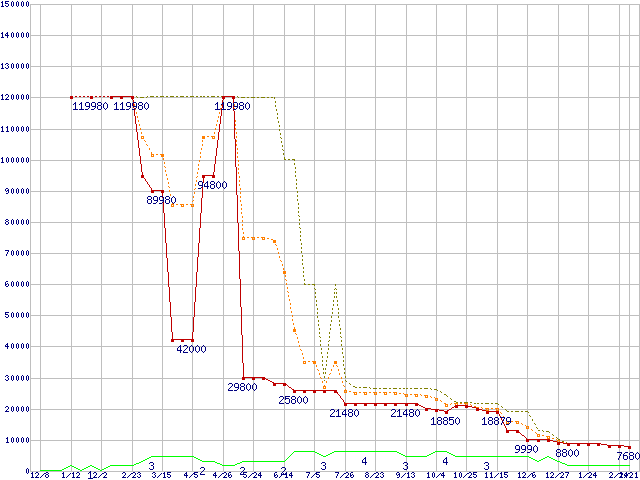 ※このグラフは過去のデータも税率5%相当に調整した税込み相当額のグラフです。 税率変更や、総額表示方式導入(2004年4月)の影響は除いています。 | | | ●凡例 | 最安値 (点線部は販売店未確認 または未調査) | 平均値 | 最高値 | ショップ数 |