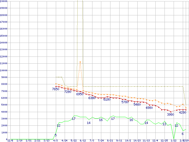 ※このグラフは過去のデータも税率5%相当に調整した税込み相当額のグラフです。 税率変更や、総額表示方式導入(2004年4月)の影響は除いています。 | | | ●凡例 | 最安値 (点線部は販売店未確認 または未調査) | 平均値 | 最高値 | ショップ数 |