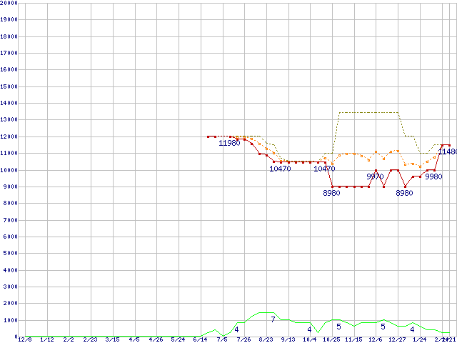 ※このグラフは過去のデータも税率5%相当に調整した税込み相当額のグラフです。 税率変更や、総額表示方式導入(2004年4月)の影響は除いています。 | | | ●凡例 | 最安値 (点線部は販売店未確認 または未調査) | 平均値 | 最高値 | ショップ数 |