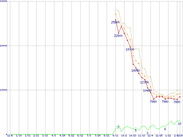 ※このグラフは過去のデータも税率5%相当に調整した税込み相当額のグラフです。 税率変更や、総額表示方式導入(2004年4月)の影響は除いています。 | | | ●凡例 | 最安値 (点線部は販売店未確認 または未調査) | 平均値 | 最高値 | ショップ数 |