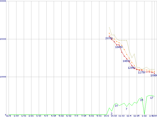 ※このグラフは過去のデータも税率5%相当に調整した税込み相当額のグラフです。 税率変更や、総額表示方式導入(2004年4月)の影響は除いています。 | | | ●凡例 | 最安値 (点線部は販売店未確認 または未調査) | 平均値 | 最高値 | ショップ数 |