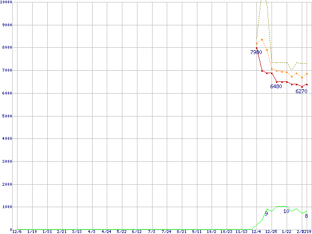 ※このグラフは過去のデータも税率5%相当に調整した税込み相当額のグラフです。 税率変更や、総額表示方式導入(2004年4月)の影響は除いています。 | | | ●凡例 | 最安値 (点線部は販売店未確認 または未調査) | 平均値 | 最高値 | ショップ数 |