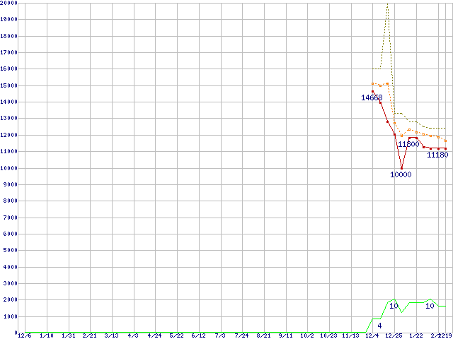 ※このグラフは過去のデータも税率5%相当に調整した税込み相当額のグラフです。 税率変更や、総額表示方式導入(2004年4月)の影響は除いています。 | | | ●凡例 | 最安値 (点線部は販売店未確認 または未調査) | 平均値 | 最高値 | ショップ数 |
