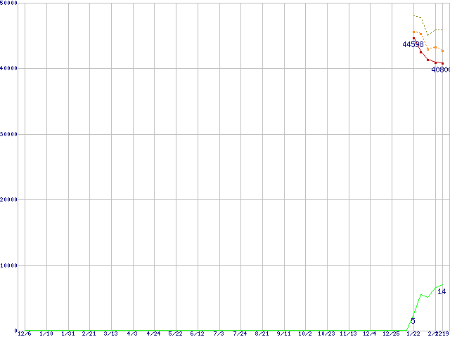 ※このグラフは過去のデータも税率5%相当に調整した税込み相当額のグラフです。 税率変更や、総額表示方式導入(2004年4月)の影響は除いています。 | | | ●凡例 | 最安値 (点線部は販売店未確認 または未調査) | 平均値 | 最高値 | ショップ数 |
