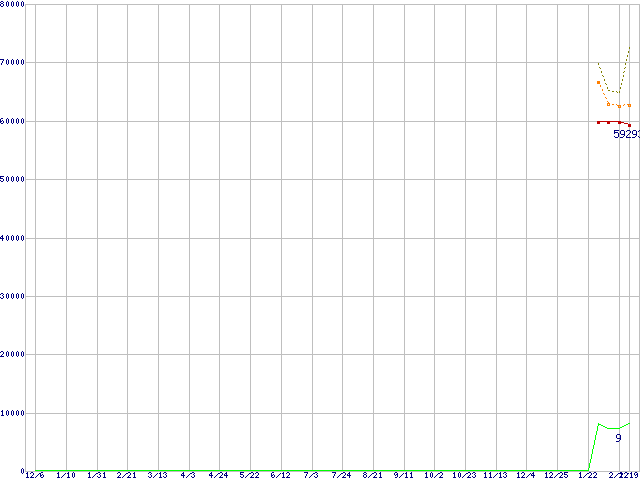 ※このグラフは過去のデータも税率5%相当に調整した税込み相当額のグラフです。 税率変更や、総額表示方式導入(2004年4月)の影響は除いています。 | | | ●凡例 | 最安値 (点線部は販売店未確認 または未調査) | 平均値 | 最高値 | ショップ数 |