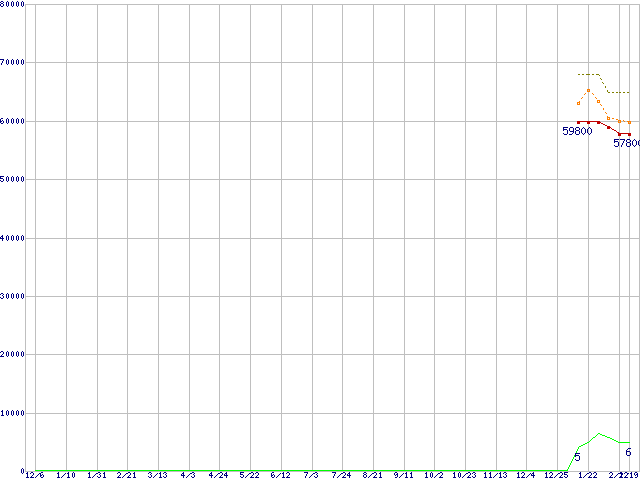 ※このグラフは過去のデータも税率5%相当に調整した税込み相当額のグラフです。 税率変更や、総額表示方式導入(2004年4月)の影響は除いています。 | | | ●凡例 | 最安値 (点線部は販売店未確認 または未調査) | 平均値 | 最高値 | ショップ数 |