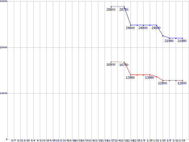 | 2.5" SATA Solid State Drive 300 (SSD,2.5インチ,リード158MB/s・ライト100MB/s)の最安値推移 | | | (2008年8月7日~2009年2月19日) |