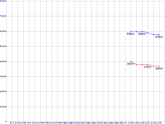 | TITAN (SSD,3Gb/s,2.5インチ,リード200MB/s・ライト160MB/s)の最安値推移 | | | (2008年8月7日~2009年2月19日) |