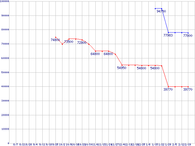 | X25-M Mainstream SATA SSD (SSD,3Gb/s,2.5インチ,リード250MB/s・ライト70MB/s)の最安値推移 | | | (2008年8月7日~2009年2月19日) |