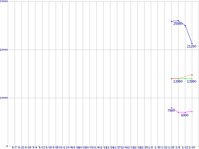 | SATA II 2.5" SSD (SSD,2.5インチ,リード170~178MB/s・ライト95~98MB/s)の最安値推移 | | | (2008年8月7日~2009年2月19日) |