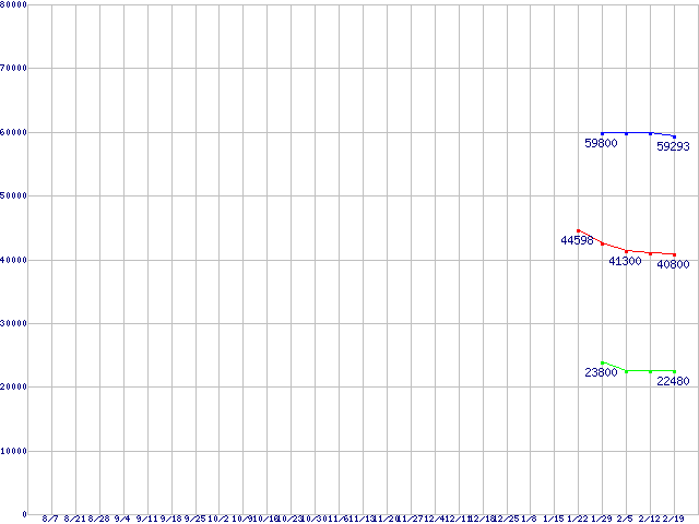 | OCZ Apex Series SATA II 2.5" SSD (SSD,3Gb/s,2.5インチ,リード230MB/s・ライト160~110MB/s)の最安値推移 | | | (2008年8月7日~2009年2月19日) |
