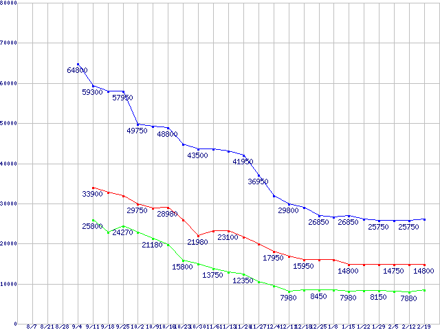 | PATRIOT Extreme Performance Warp Solid State Disk (SSD,3Gb/s,2.5インチ,リード175MB/s・ライト100MB/s)の最安値推移 | | | (2008年8月7日~2009年2月19日) |