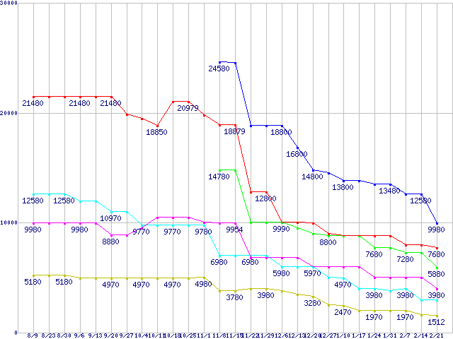 PC3-12800(DDR3-1600) DDR3 SDRAM DIMMの最安値推移