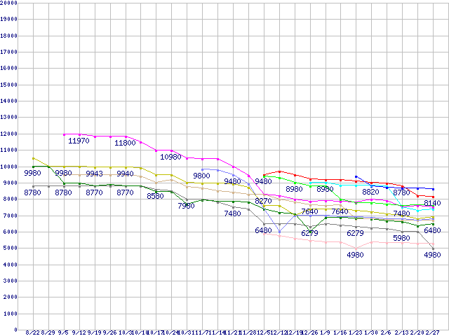 | CPU主要製品(最安値1万円未満)の最安値推移 | | | (2008年8月22日~2009年2月27日) |