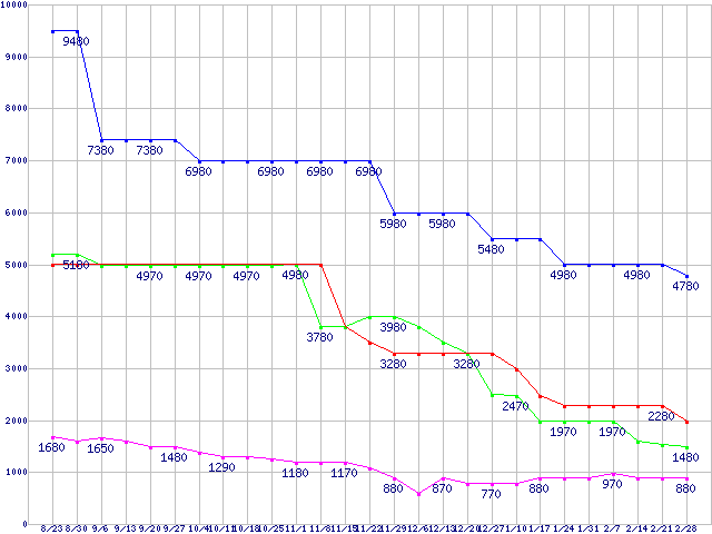 メモリ主要製品(最安値5千円未満)の最安値推移