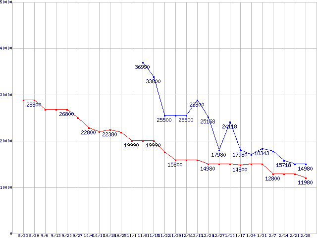メモリ主要製品(最安値1万円以上)の最安値推移