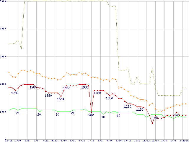 ※このグラフは過去のデータも税率5%相当に調整した税込み相当額のグラフです。 税率変更や、総額表示方式導入(2004年4月)の影響は除いています。 | | | ●凡例 | 最安値 (点線部は販売店未確認 または未調査) | 平均値 | 最高値 | ショップ数 |