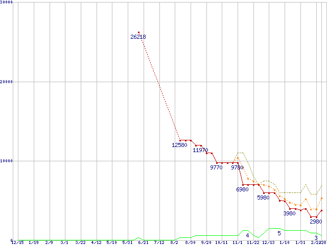 ※このグラフは過去のデータも税率5%相当に調整した税込み相当額のグラフです。 税率変更や、総額表示方式導入(2004年4月)の影響は除いています。 | | | ●凡例 | 最安値 (点線部は販売店未確認 または未調査) | 平均値 | 最高値 | ショップ数 |