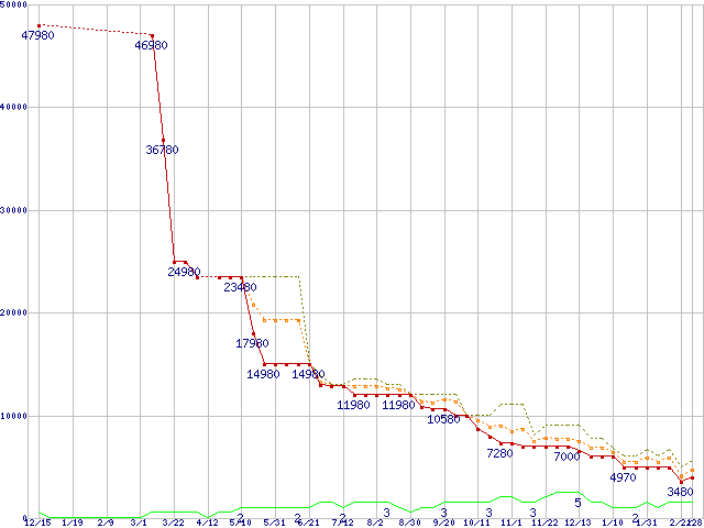 ※このグラフは過去のデータも税率5%相当に調整した税込み相当額のグラフです。 税率変更や、総額表示方式導入(2004年4月)の影響は除いています。 | | | ●凡例 | 最安値 (点線部は販売店未確認 または未調査) | 平均値 | 最高値 | ショップ数 |