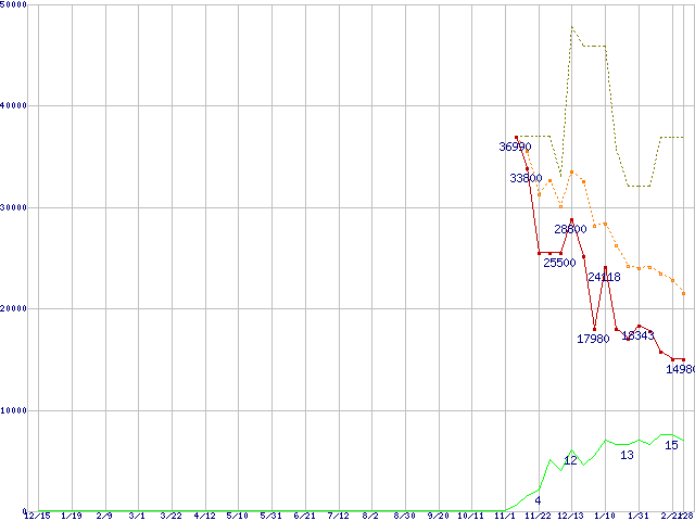 ※このグラフは過去のデータも税率5%相当に調整した税込み相当額のグラフです。 税率変更や、総額表示方式導入(2004年4月)の影響は除いています。 | | | ●凡例 | 最安値 (点線部は販売店未確認 または未調査) | 平均値 | 最高値 | ショップ数 |