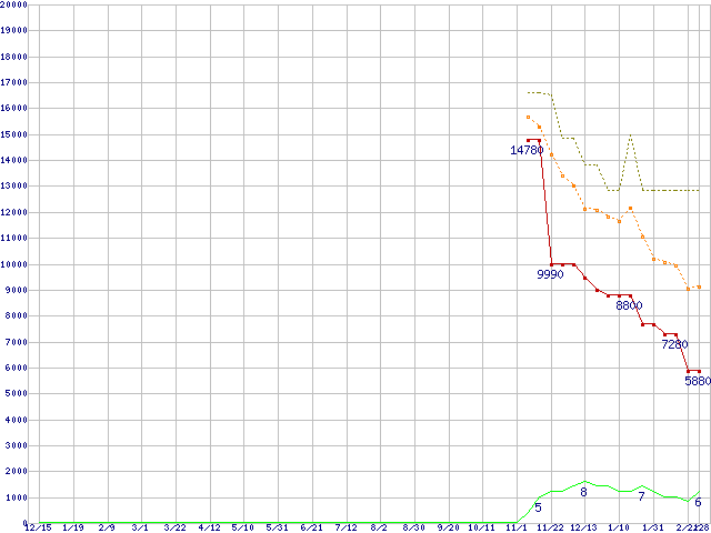 ※このグラフは過去のデータも税率5%相当に調整した税込み相当額のグラフです。 税率変更や、総額表示方式導入(2004年4月)の影響は除いています。 | | | ●凡例 | 最安値 (点線部は販売店未確認 または未調査) | 平均値 | 最高値 | ショップ数 |