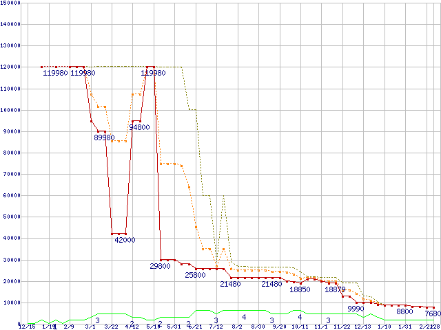 ※このグラフは過去のデータも税率5%相当に調整した税込み相当額のグラフです。 税率変更や、総額表示方式導入(2004年4月)の影響は除いています。 | | | ●凡例 | 最安値 (点線部は販売店未確認 または未調査) | 平均値 | 最高値 | ショップ数 |