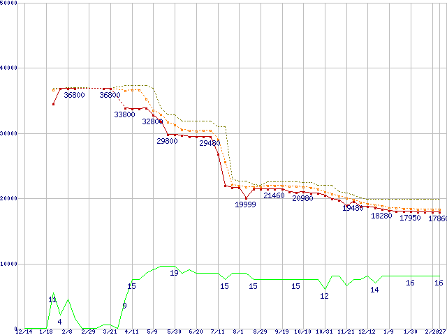 | Core 2 Duo E8500 (3.16GHz,L2 6MB)の価格推移 | | | (2007年12月14日~2009年2月27日) |