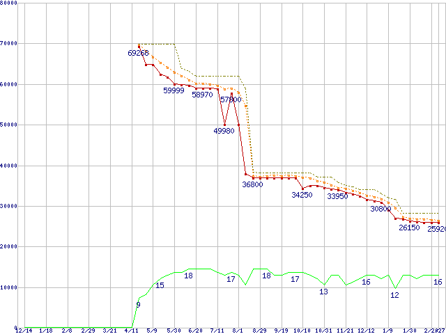 | Core 2 Quad Q9550 (2.83GHz,L2 6MB×2)の価格推移 | | | (2007年12月14日~2009年2月27日) |
