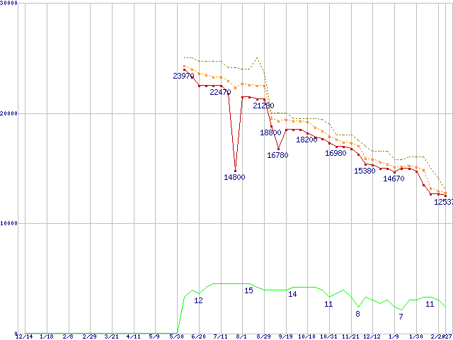 ※このグラフは過去のデータも税率5%相当に調整した税込み相当額のグラフです。 税率変更や、総額表示方式導入(2004年4月)の影響は除いています。 | | | ●凡例 | 最安値 (点線部は販売店未確認 または未調査) | 平均値 | 最高値 | ショップ数 |