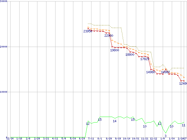 ※このグラフは過去のデータも税率5%相当に調整した税込み相当額のグラフです。 税率変更や、総額表示方式導入(2004年4月)の影響は除いています。 | | | ●凡例 | 最安値 (点線部は販売店未確認 または未調査) | 平均値 | 最高値 | ショップ数 |