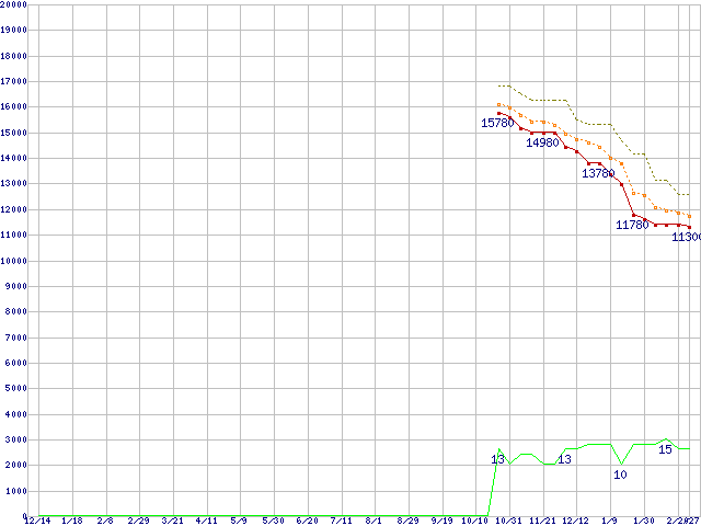 ※このグラフは過去のデータも税率5%相当に調整した税込み相当額のグラフです。 税率変更や、総額表示方式導入(2004年4月)の影響は除いています。 | | | ●凡例 | 最安値 (点線部は販売店未確認 または未調査) | 平均値 | 最高値 | ショップ数 |