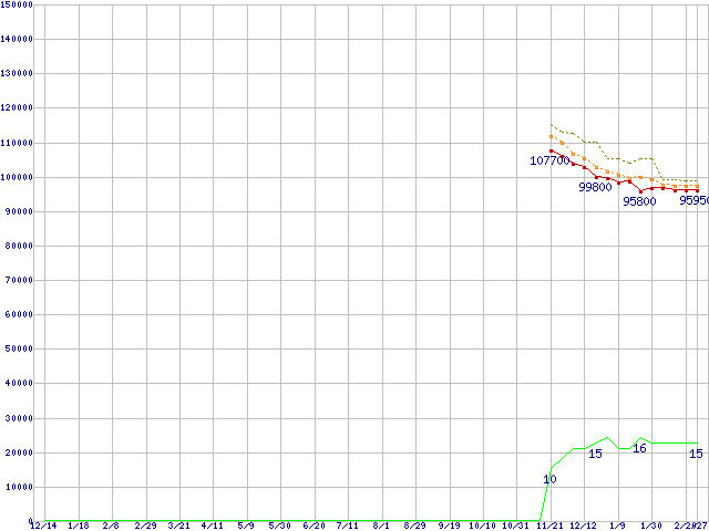 ※このグラフは過去のデータも税率5%相当に調整した税込み相当額のグラフです。 税率変更や、総額表示方式導入(2004年4月)の影響は除いています。 | | | ●凡例 | 最安値 (点線部は販売店未確認 または未調査) | 平均値 | 最高値 | ショップ数 |
