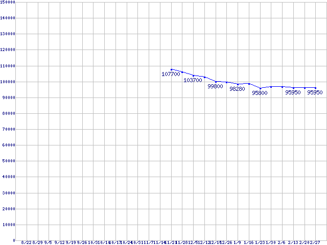 | LGA1366 (QPI 6.4GT/s,L3キャッシュ8MB,Quad Core,Hyper-Threading)の最安値推移 | | | (2008年8月22日~2009年2月27日) |