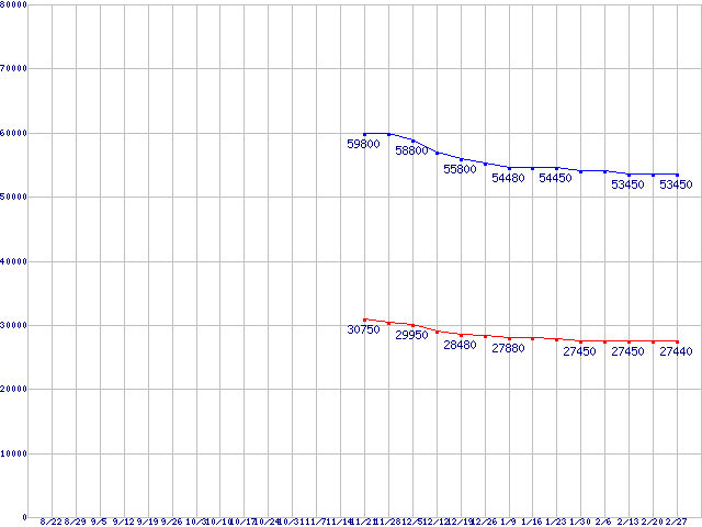 | LGA1366 (QPI 4.8GT/s,L3キャッシュ8MB,Quad Core,Hyper-Threading)の最安値推移 | | | (2008年8月22日~2009年2月27日) |