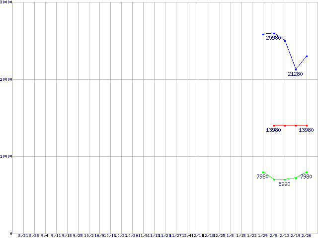 | SATA II 2.5" SSD (SSD,2.5インチ,リード170~178MB/s・ライト95~98MB/s)の最安値推移 | | | (2008年8月21日~2009年2月26日) |