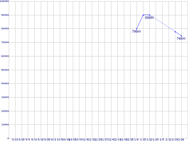 | Warp Series SSD v3 (SSD,3Gb/s,2.5インチ,リード240MB/s・ライト160MB/s)の最安値推移 | | | (2008年8月21日~2009年2月26日) |
